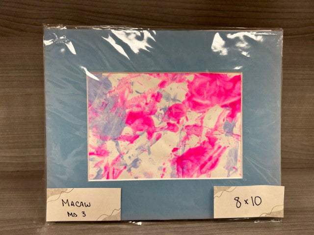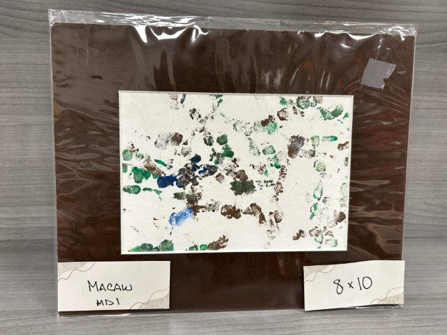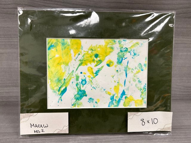The macaw walks through the paint and then onto the paper!   Art includes a Certificate of Authenticity and a photo of the artist.